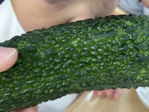 ゴーヤの姿かたちを目にして、首を振って近寄ることに抵抗を示す子がいる一方で、興味津々で匂いを嗅いだり、給食を食べつつ触っていたりする姿がありました。中でも、ゴーヤを近づけると思わず口を開けて食べようとするような仕草を見せる子の姿が、とてもほほえましいひと時でした。