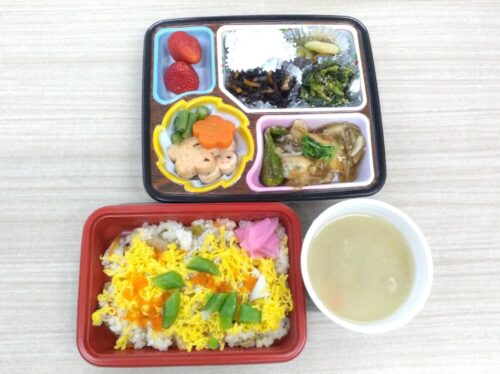 今日のランチは、特別企画として同法人のフレンズホームで作る『フレンズ弁当』です。事務長自らお弁当を届けてくださって、一言ご挨拶もいただきました!施設の管理栄養士さんからは高齢者に必要な栄養量を考慮した、とっても美味しいお弁当の提供に加え、お弁当についても丁寧な説明をしてくださいました!彩りもよく春らしい心が明るくなるお弁当は、美味しくて大満足!