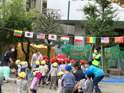 当日までに様々な国の文化や言葉、生活に触れて過ごす中で、子ども達が表現した万国旗が頭上ではためいていました。