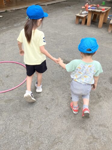 年長児のお兄さんに「一緒に行こう。」「お靴、手伝うね。」と声を掛けられると、にこにこと嬉しそうに行動を共にしていました。5歳児から「寝る時にもトントンに行こうかな。」などの言葉が聞かれ、ほほえましいです。