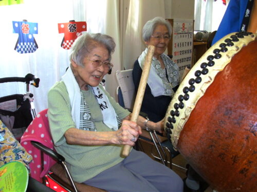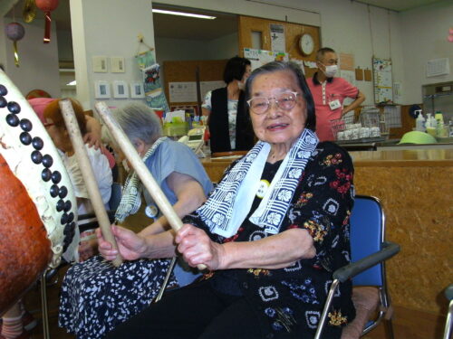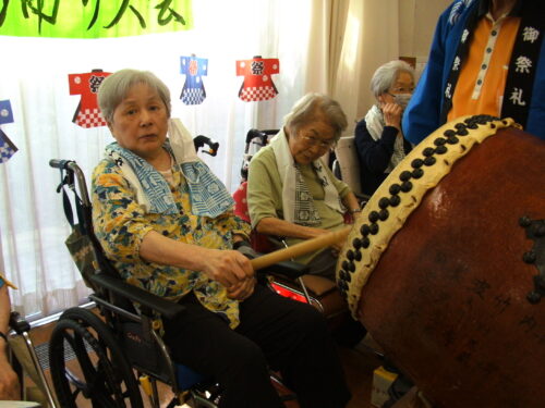 太鼓を叩く機会は年に一回!「東京音頭」や「炭坑節」に合わせて力強く叩いてもらいました。