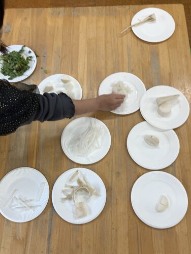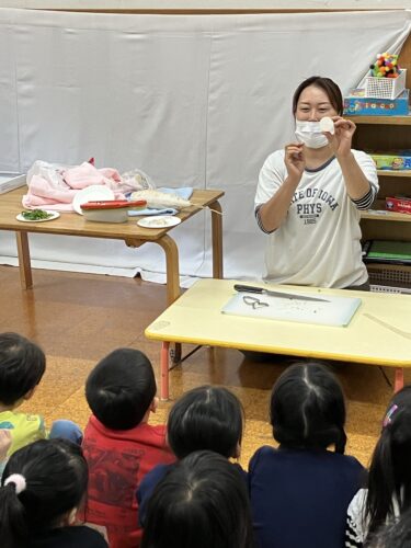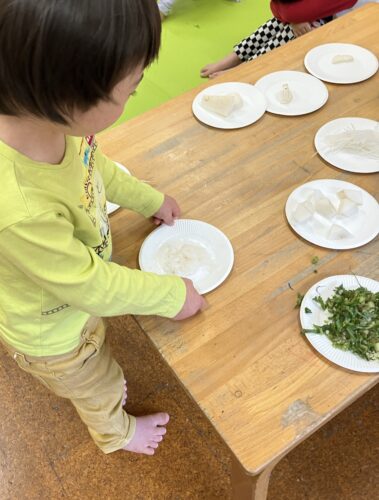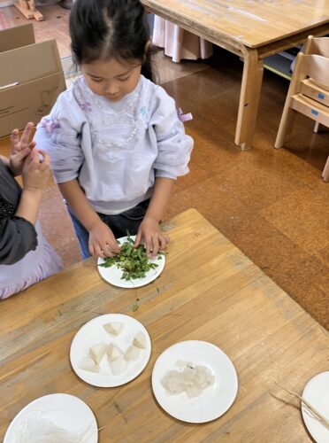 「大根で何ができるかな?」「知っている大根の料理は?」と問いかけられて答えたり、いろいろな形に切った大根を見ることで「おでんに入ってるよね。」とお話が弾んでいたり♪