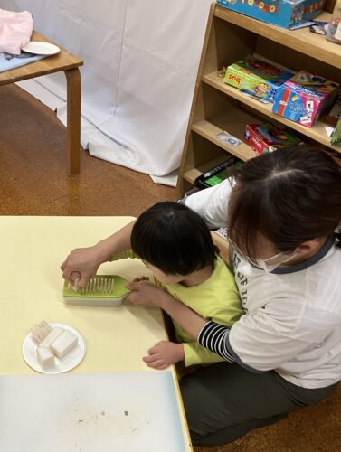 大根おろしを目の前で行ってみると、部屋中に漂った大根の匂いに「大根の匂いがいっぱい。」との声が聞かれ、触ってみる場面では感触の面白さを感じている子ども達でした。
