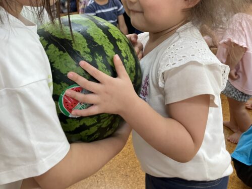 乳児クラスは、丸ごとの大きいスイカを手の平でぺちぺちと叩く、そっと触ってみるなど、一人ひとりが興味津々な様子。