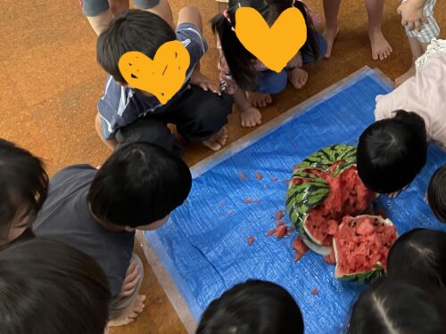 元々は目隠しをして楽しむものだと分かっている子は、ちょっぴり薄目でスイカに近づいていく姿が見られました。目を開けてよく見てスイカに向かっていく子、カラーセロファンで作ったスイカのお面を付けて叩く子など、それぞれの楽しみ方で参加し、夏の思い出のひと時となりました。