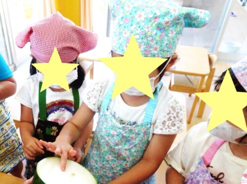 給食の「ベーコンと冬瓜のスープ」の冬瓜を5歳児が切りました。