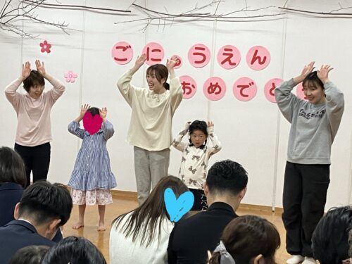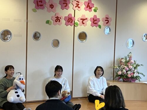 今年度4月から仲間入りしたお友だちと、昨年度の途中で入園されたお友だちが参加する中、土曜日登園の年長児が保育者と一緒に手遊びをする場面があり、和やかな会となりました。